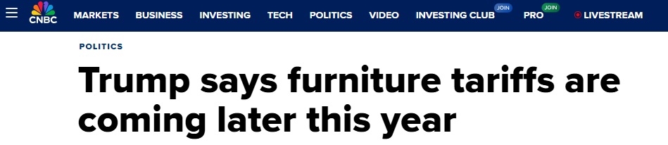 CNBC称,任何新的关税都会对面临一系列挑战的美国家具行业造成困难。