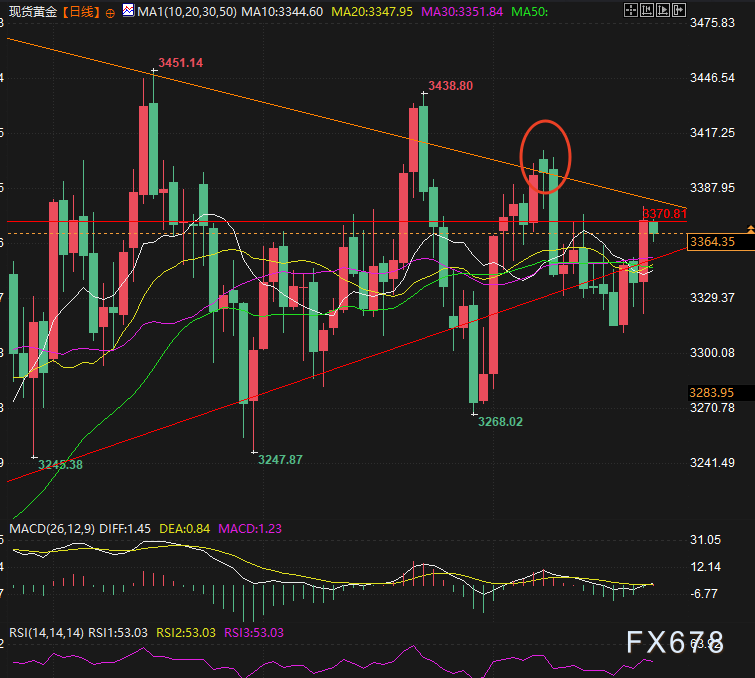 正如上篇分析过的,现货黄金价格上涨,重新站上日线的原始X线,同时金价在10、20、30日均线上方,均线即将全体多头排列,MACD,KDJ均处在多头进攻区域,这里利好金价上行,3370.9是第一压力位,即8月11日黄昏之星的关键位。