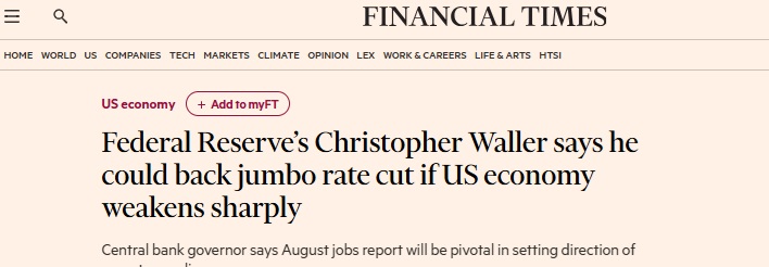 然而,沃勒表示,如果将于一周后发布的8月份就业报告显示经济大幅疲软且通胀仍得到良好控制,他的观点“可能会改变”。
