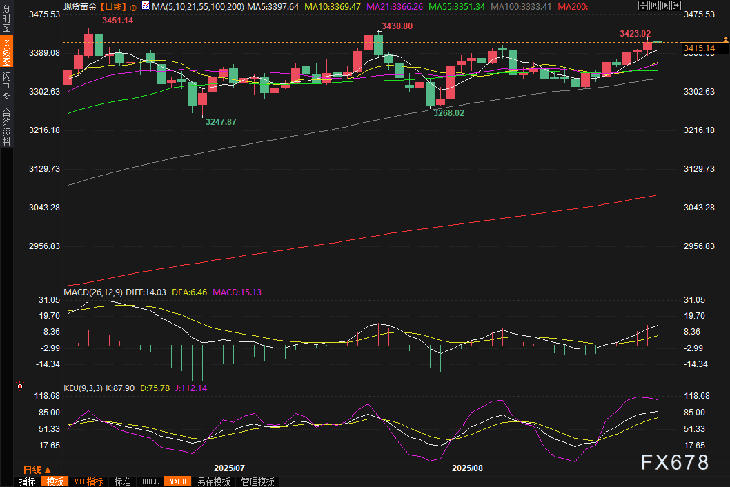 周五(8月29日)亚市早盘,现货黄金窄幅震荡,目前交投于3415.37美元/盎司附近。周四(8月28日),现货黄金价格强势突破3400美元心理关口,最高触及每盎司3423.02美元,创下自7月23日以来的五周最高点。这场金价飙升的背后,是美元走软、美联储独立性担忧以及避险资金涌入等多重因素的共同推动。白银同样表现抢眼,攀升至一个多月来的最高水平,彰显贵金属板块的整体强势。这场由政治、经济和市场情绪共同演绎的"黄金大戏",正在全球投资者面前精彩上演。