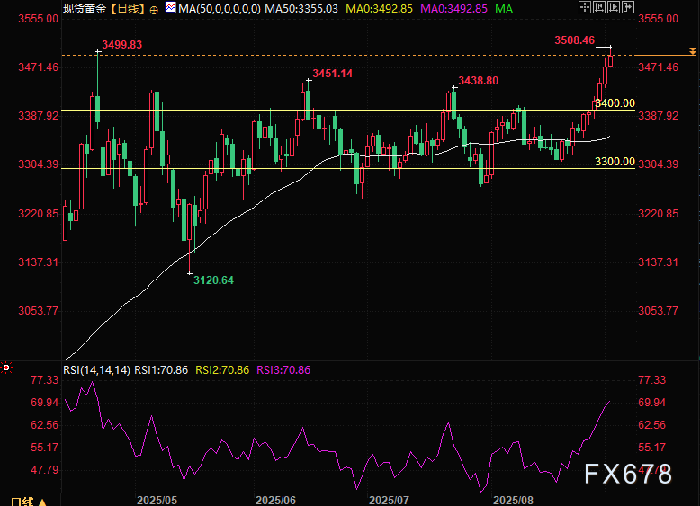 横盘区间突破:过去数周束缚金价的横盘结构已被打破,近期涨势成功推动价格突破每盎司3400美元关口。若后续交易时段买盘压力保持稳定,此次突破可能为更明确的看涨趋势打开通道。