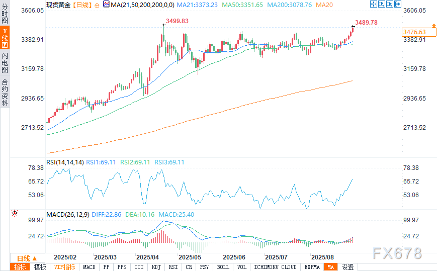 动能指标进一步强化了看涨倾向:相对强弱指数(RSI)徘徊于69附近,接近超买区间,表明买盘力量强劲但尚未耗尽;移动平均收敛散度(MACD)指标维持稳固的金叉形态,且MACD线与信号线之间的差距不断扩大,显示上行动能正在增强。红色柱状图持续放大,进一步证实买盘压力加速积聚——只要金价守住短期支撑位,上涨趋势就有望延续。