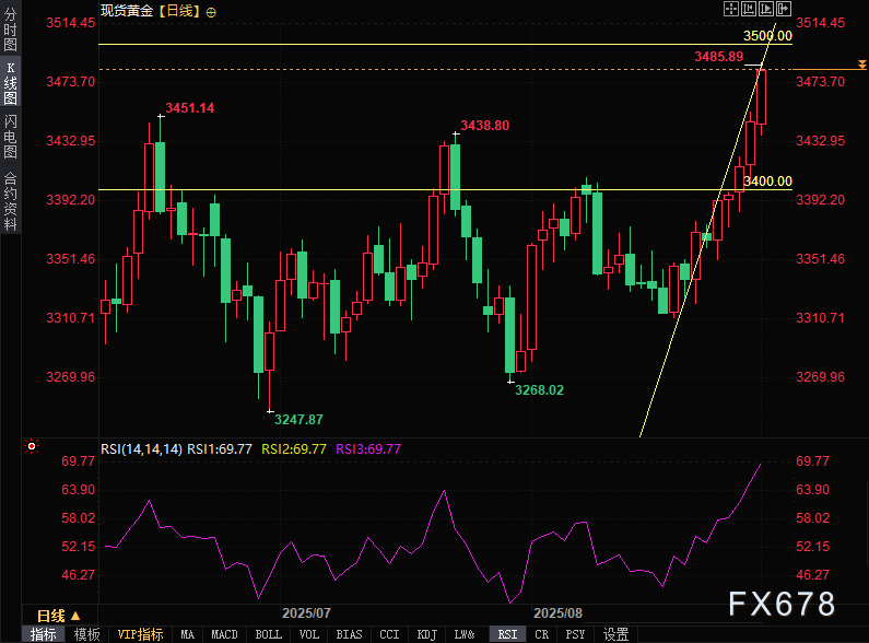 黄金成功摆脱夏季的低迷态势,价格强势上涨,周线与月线双双刷新历史最高收盘纪录。周一(9月1日)亚欧时段,现货黄金延续涨势,一度上涨逾1%至3489.78美元/盎司,刷新了4月22日以来高点,逼近历史高点3500关口附近关键位置。