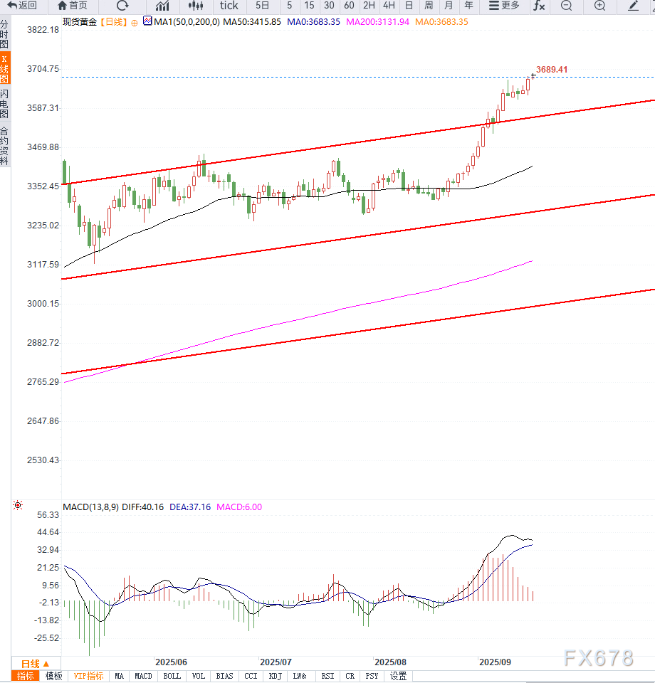 黄金创新高后进入盘整。现货黄金(XAU/USD)在亚洲时段触及3689-3690美元的历史新高后小幅回落,因投资者在本周多家央行公布政策前进行仓位调整。