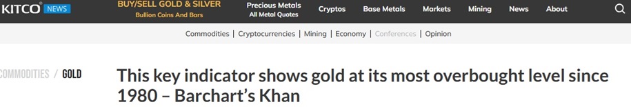 Khan在周三发表的一篇文章中表示,在近期金价上涨之后,黄金的超买程度已达到近半个世纪以来的最高水平。