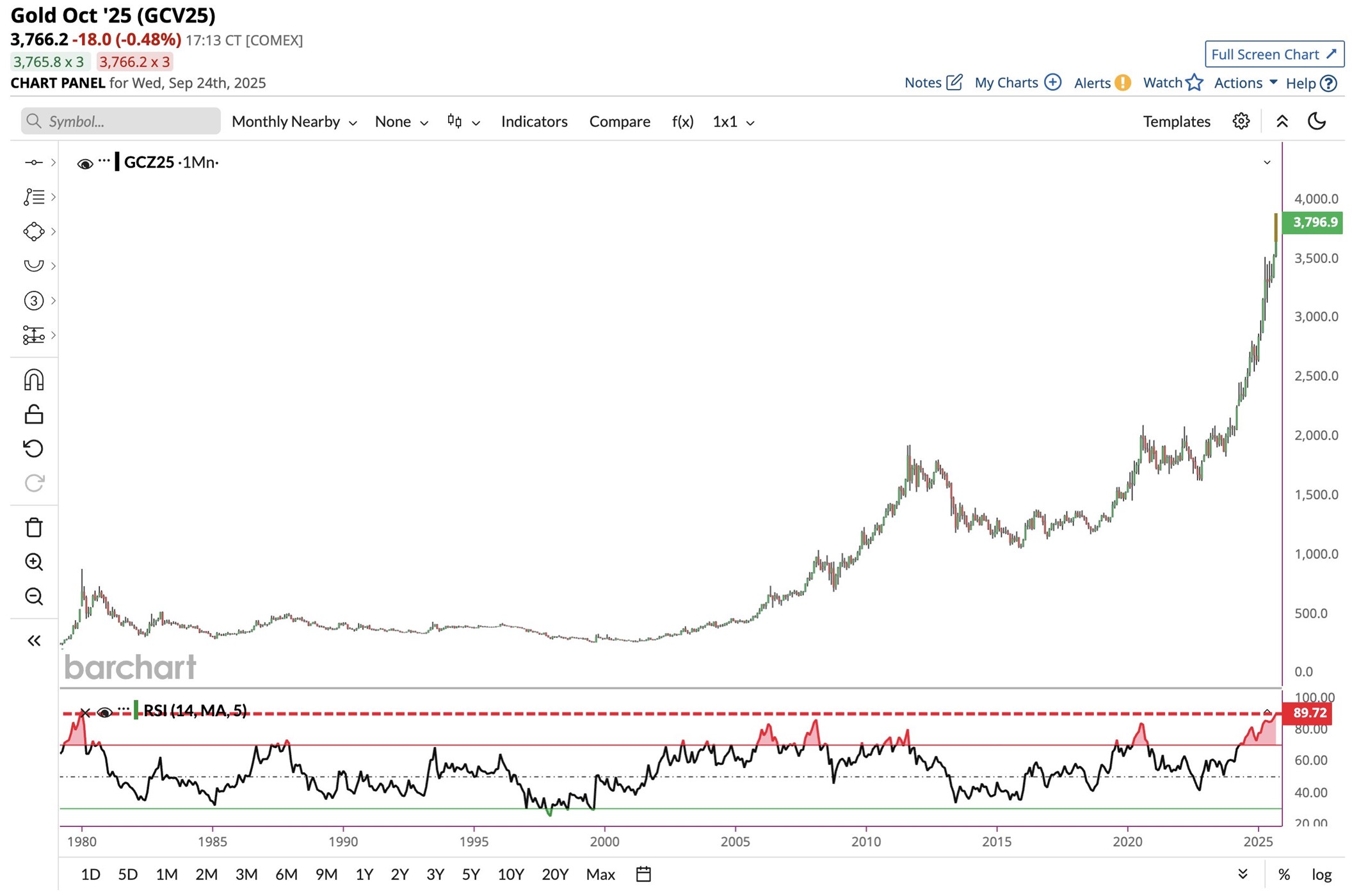 他写道:“黄金的相对强弱指数(RSI)目前在月度图表上为89.72,这是自至少1980年以来的最高读数。”