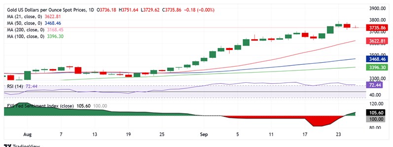 24K99讯 周四(9月25日)亚市尾盘,现货黄金维持日内反弹走势,目前金价位于3745美元/盎司附近。FXStreet高级分析师Dhwani Mehta撰文,对金价技术走势进行分析。