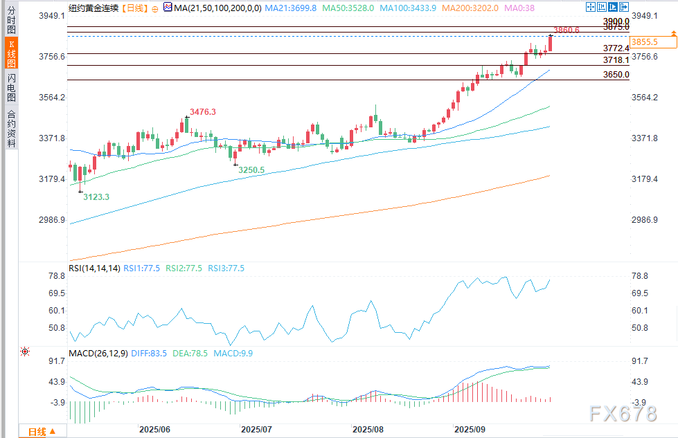 从技术面来看,12月黄金期货多头在近期整体技术面占据明显优势。多头的下一个上行目标是推动期货收盘价突破4000美元/盎司的关键阻力位。空头的近期下行目标则是将期货价格压至3700美元/盎司的关键技术支撑位下方。第一阻力位见于3875美元/盎司,进一步阻力位在3900美元/盎司;第一支撑位见于3800美元/盎司,进一步支撑位为隔夜触及的本周低点3785.50美元/盎司。