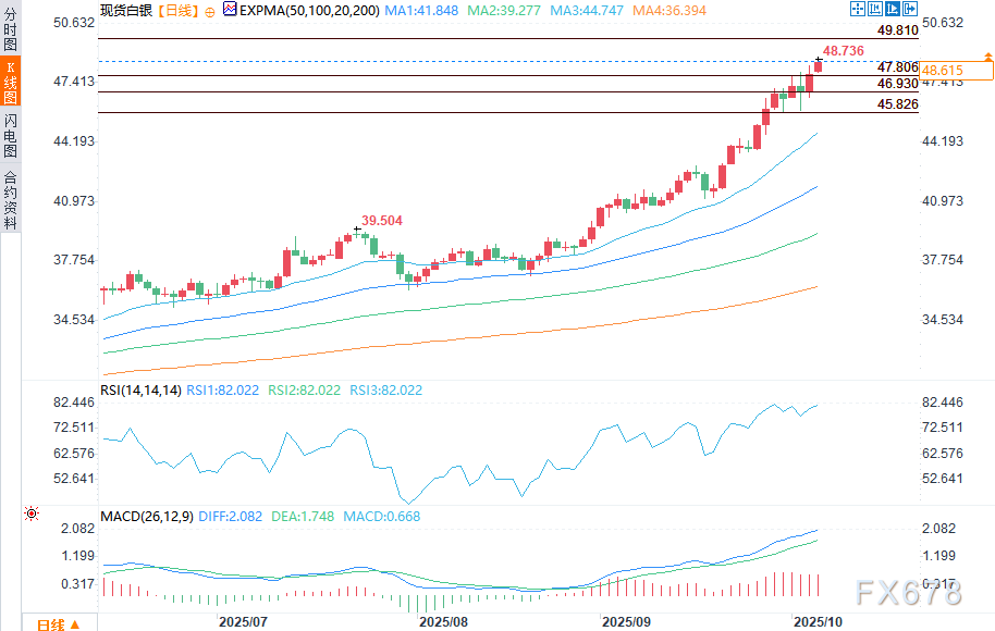 周一(10月6日),白银延续看涨行情,突破上周48.347美元的高点,盘中触及48.736美元的峰值。这一波上涨使得49.81美元的多年关键高点重新成为焦点,同时50.00美元这一心理关口也已清晰可见。受美国政府停摆风险持续发酵,以及市场对美联储降息预期不断增强的推动,白银正借助黄金避险买盘的东风走高。上周五白银收于47.972美元,为周一的突破奠定了基础。尽管看涨动能仍未减弱,但交易员正谨慎关注各阻力位的表现。