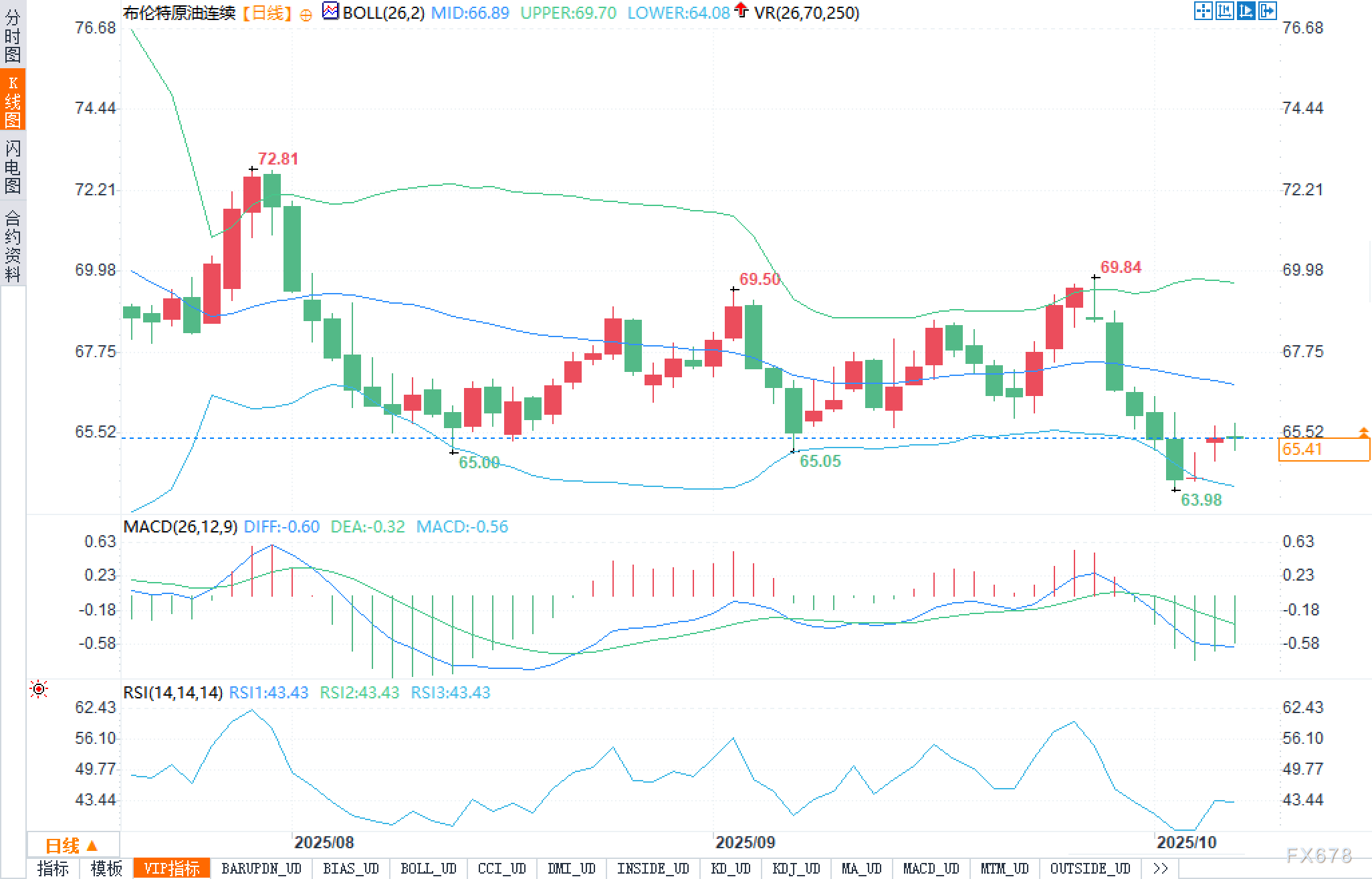 短线:若布伦特近端时差进一步走阔(如向0.50美元/桶靠拢),油价大概率尝试技术性反弹,目标首先指向布林中轨66.89,其后是69.50/69.84的密集阻力带;若反弹过程中量能(价差与期限结构)不能配合,易在中轨附近反复。