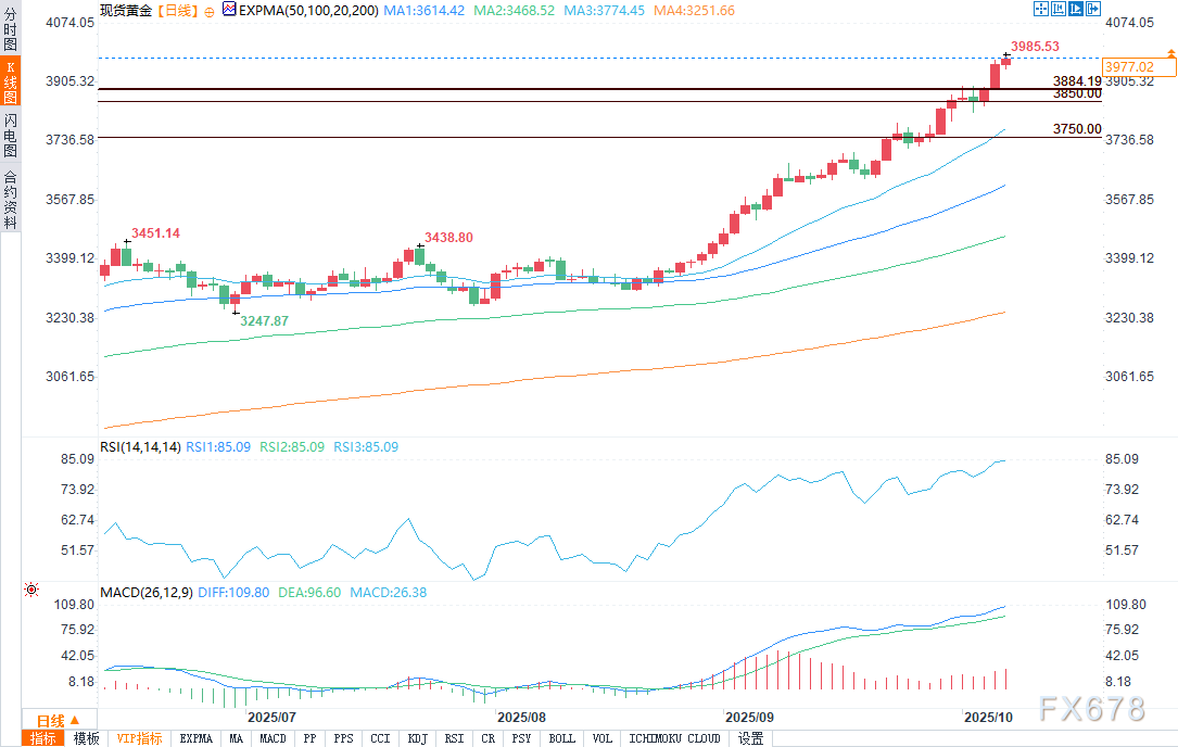 除非金价能站稳在3884.11美元上方,并明确突破4000美元关口,否则交易员应警惕上行动能耗尽的风险。