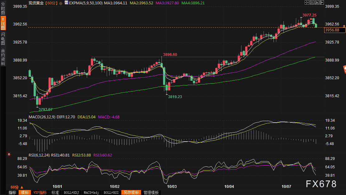美元在上一交易日从9月底高点附近回落之后,重新获得一些积极动能,目前交投于98.28附近,涨幅约0.2%,限制了黄金在亚洲时段触及新历史高点的上涨。纳斯达克和标普500指数在周一创下新纪录收盘高点,为下周第三季度财报季做准备,这进一步限制了在超买条件下的避险黄金。