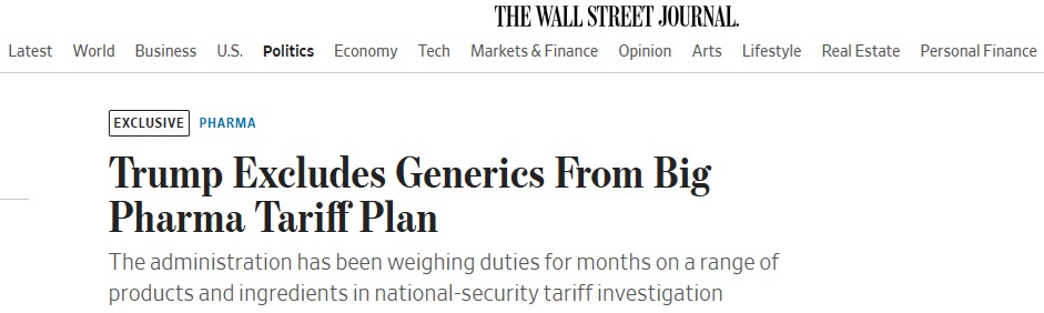 《华尔街日报》指出,不对仿制药征收关税的决定,代表着美国商务部对药品关税调查范围的大幅缩减。今年4月,药品关税调查宣布时,《联邦公报》的通知明确指出,调查将针对“仿制药和非仿制药成品”,以及药品成分。