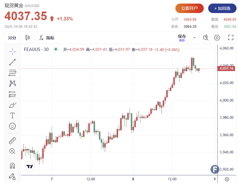 截至发稿,现货黄金上涨1.33%,至每盎司 4037.35美元;12月交割的美国黄金期货同样上涨1.4%,至 4061.80美元。