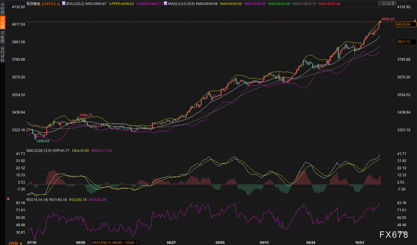 周三(10月8日),现货黄金价格延续强势格局,并刷新历史高点至4049.43美元/盎司。这一突破4000美元大关的行情并非孤立事件,而是美国政府关门进入第7天、联储降息预期升温以及地缘不确定性叠加的直接产物。从4小时图观察,价格已脱离近期盘整区间,呈现出明显的多头主导特征,但超买信号的积累也提醒交易者注意潜在的节奏调整。以下分析将结合最新盘面和技术指标,逐层剖析当前走势,并融入基本面驱动因素,旨在为专业交易者提供清晰的逻辑框架。