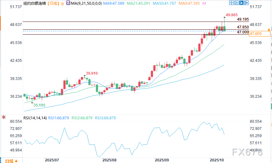 周四(10月9日)美市盘中,黄金期货与白银期货价格走弱。此前,金价在周三创下历史新高,银价也升至14年来高点,短线期货交易者因此展开获利了结操作。当前美国政府停摆,叠加其他不确定的地缘政治因素,市场对贵金属的避险需求保持稳定,这将在短期内为两种贵金属提供价格支撑。12月交割的黄金期货价格盘中下跌70.8美元,报3999.7美元(目前高于现货金十几美元);12月交割的白银期货价格盘中下跌1.424美元,报47.57美元。