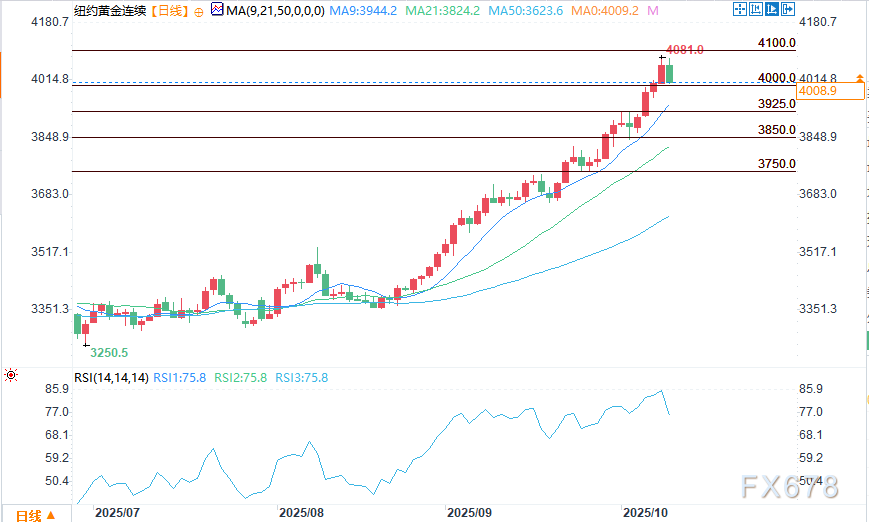 从技术面来看,12月黄金期货多头在短期内拥有显著的整体技术优势。多头的下一个上行价格目标是推动期货收盘价突破4100.00美元的关键阻力位。空头的下一个短期下行价格目标是将期货价格压至3850.00美元的关键技术支撑位下方。第一阻力位见于4081.00美元的历史高点,其次为4100.00美元;第一支撑位见于4019.20美元的隔夜低点,其次为4000.00美元。