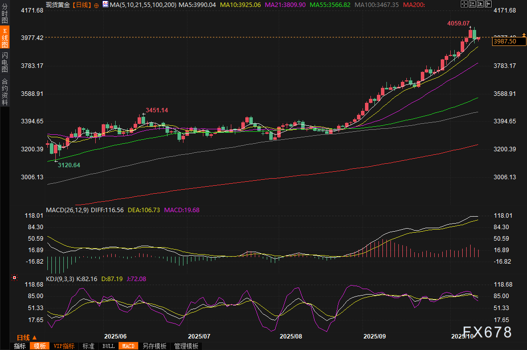驱动此轮下跌的直接诱因,是美元指数的持续走强以及中东地区紧张局势的暂时缓和。美元指数连续四个交易日上涨,创下近两个月新高,使得以美元计价的黄金对于海外买家而言变得更加昂贵。而以色列与哈马斯达成停火协议,则削弱了黄金作为地缘政治避险资产的光芒,促使部分投机者选择“落袋为安”。周五(10月10日)亚市早盘,现货黄金震荡微涨,目前交投于3987.60美元/盎司附近,涨幅约0.34%。
