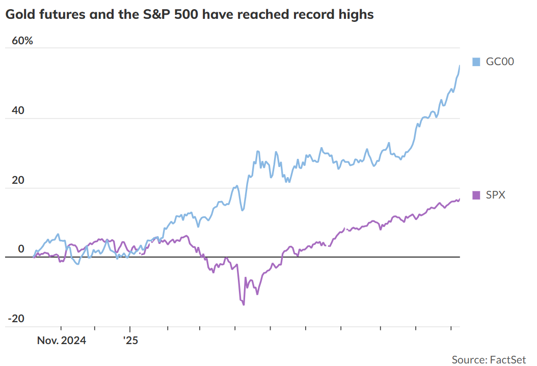 周三(10月8日)12月黄金期货合约收盘创下历史新高,达到4,070.50美元。而标普500指数也在当天创下历史最高收盘点位,达到6,753点。
