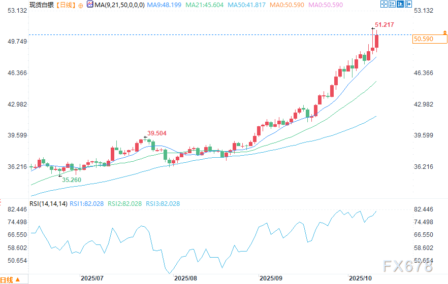 —周五(10月10日)美盘时段,白银价格保持稳定,处于前一交易日的宽幅交易区间内,这表明在高位水平市场仍存在观望情绪。现货白银守住关键的次要支撑区域,交易者正权衡是追涨新高,还是等待价格回调至更具吸引力的价值区域。