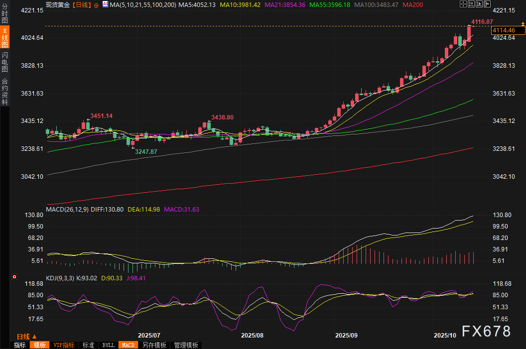 多家国际银行纷纷上调黄金价格预期,美国银行甚至将2026年目标定为5000美元/盎司。这波黄金热潮的背后,是国际贸易关系再度剑拔弩张、美联储降息概率接近100%,以及央行持续买入等结构性支撑。周二(10月14日)亚市早盘,现货黄金高位震荡,目前交投于4115.22美元/盎司附近。