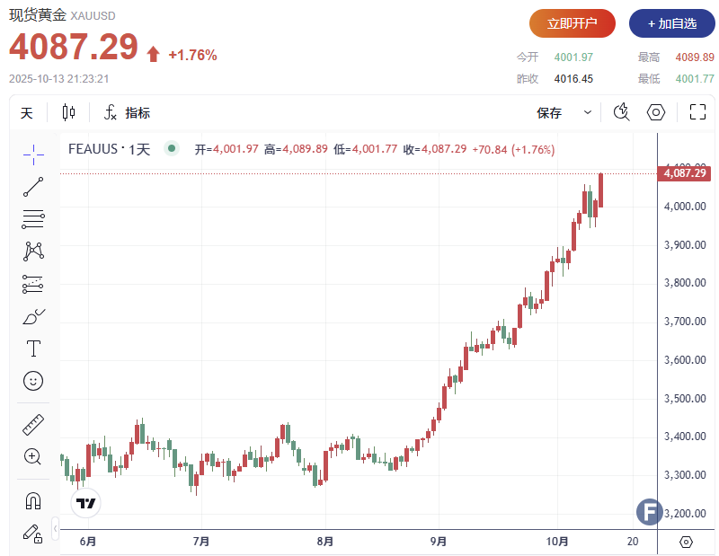 截至发稿,现货黄金(Spot Gold)上涨1.76%,报每盎司4,087.29美元,盘中一度触及历史新高4,089.89美元/盎司。