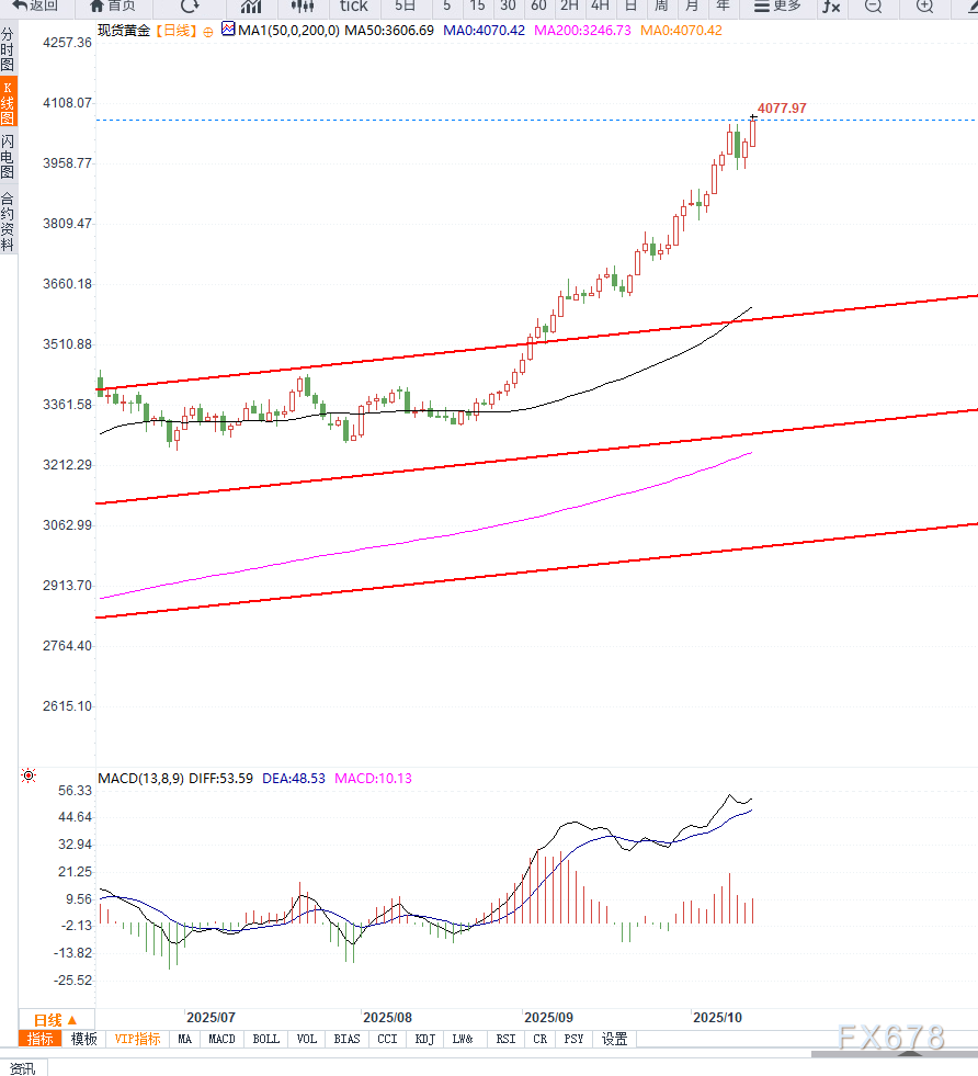 从日线级别技术面来看,黄金价格沿多周上升趋势线稳步攀升,短线突破前高4,040美元并创下历史新高。当前价格运行于5日与10日均线之上,显示多头动能依旧充足。