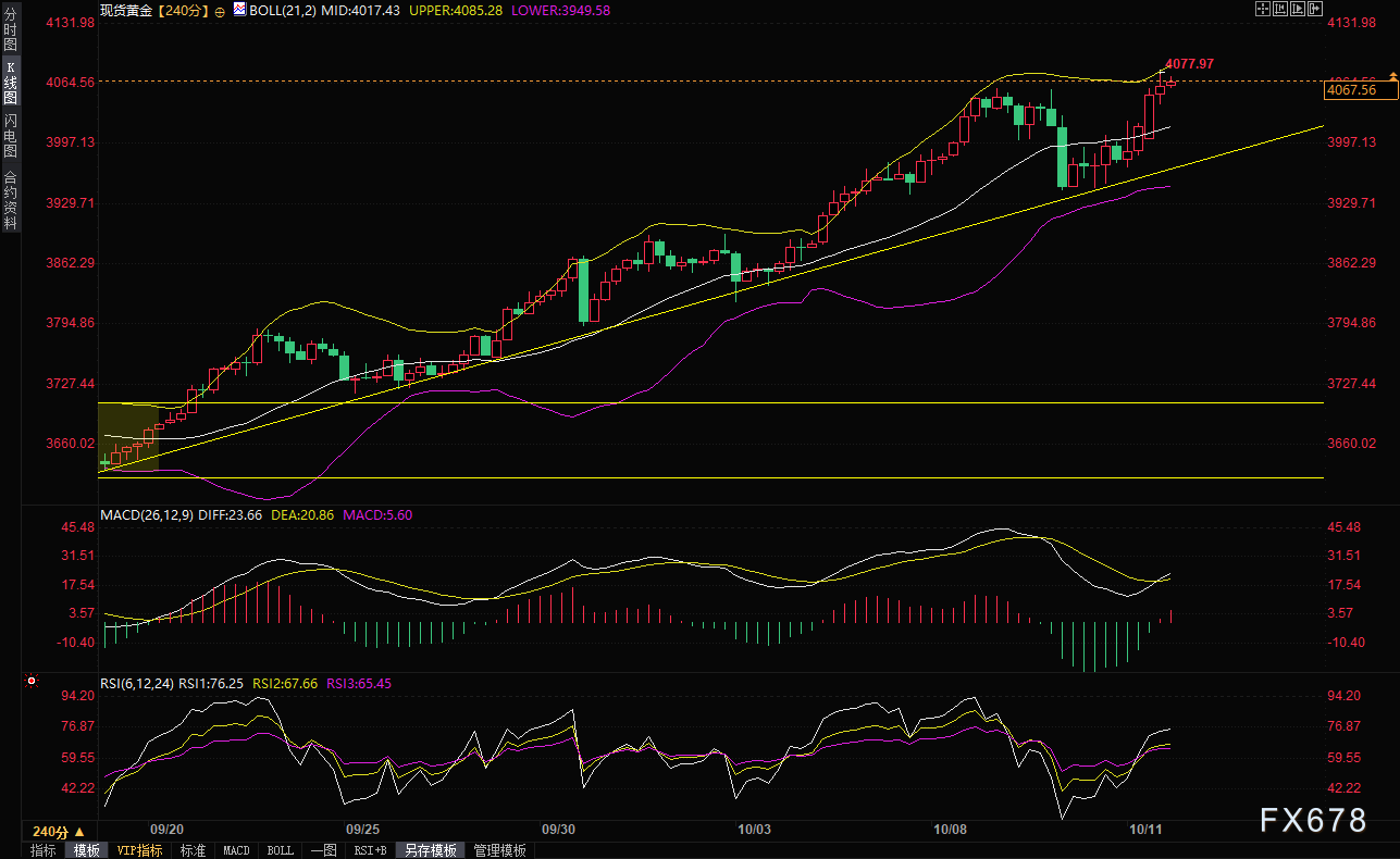 现货黄金在周一(10月13日)亚洲时段继续创下新高,一度上涨近1.5%至4077.97美元/盎司,目前小幅回落至4067.90美元/盎司附近,仍受到有利基本面背景的支撑。投资者对美国政府长期停摆和地缘政治紧张局势加剧带来的经济不确定性感到担忧。此外,国际贸易新担忧成为支撑避险贵金属需求的关键因素。