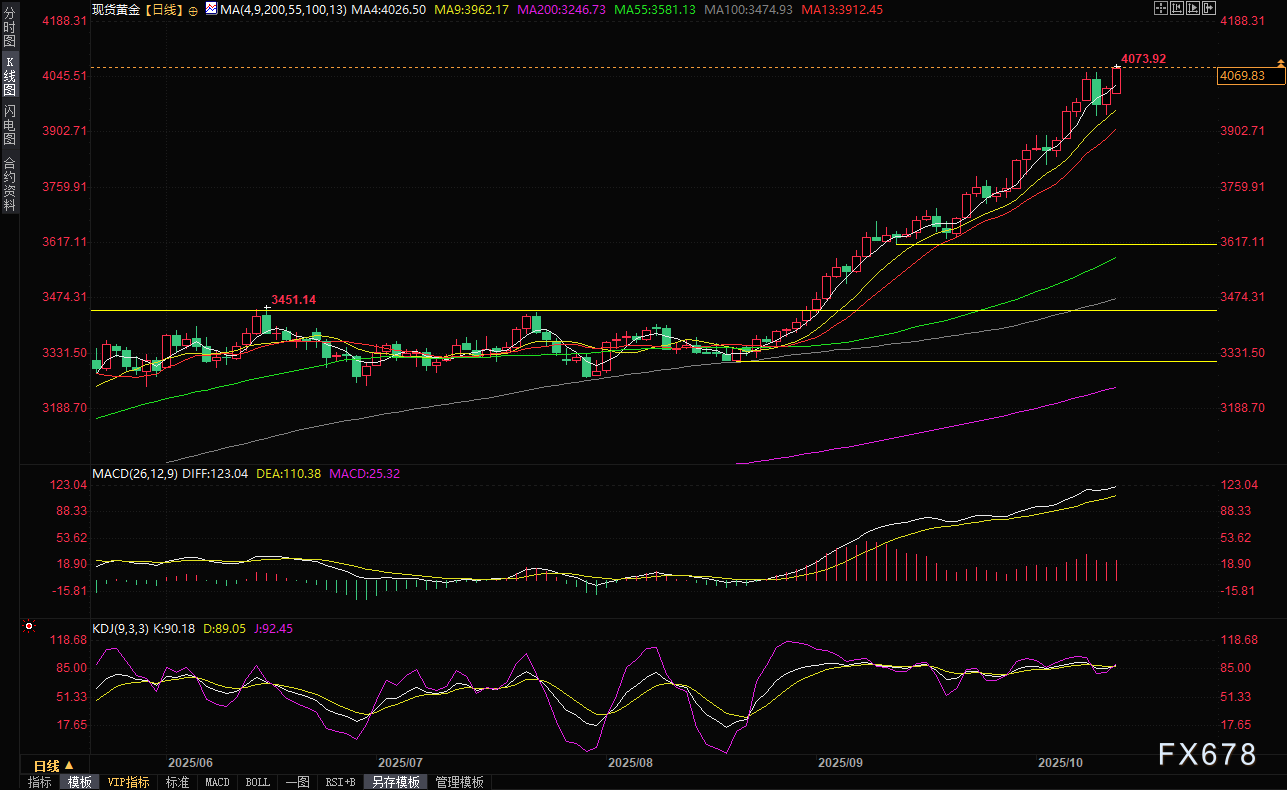 法国政局动荡强化了全球政治风险信号,黄金作为经典避险资产,自然成为资金的首选避风港。历史上,类似欧洲债务危机或政治不确定性事件(如2011年欧债危机)往往推动金价飙升,从730美元/盎司跃升至1921美元/盎司的峰值(当时的历史高点)。当前,勒科尔尼内阁面临的不信任案威胁,可能进一步放大这一效应:投资者担忧预算案延宕导致法国债务负担加重(公共债务已达GDP的116%),从而引发欧元区碎片化风险。周一金价继续上涨,截止13:30,现货黄金一度刷新历史高点至4073.92美元/盎司据,正是受法国、日本及美国关门危机、国际贸易局势等多重政治不稳影响。欧洲央行报告显示,2025年欧元区黄金衍生品敞口激增58%至1万亿欧元,反映出机构投资者对地缘与政策风险的预期持续升温。