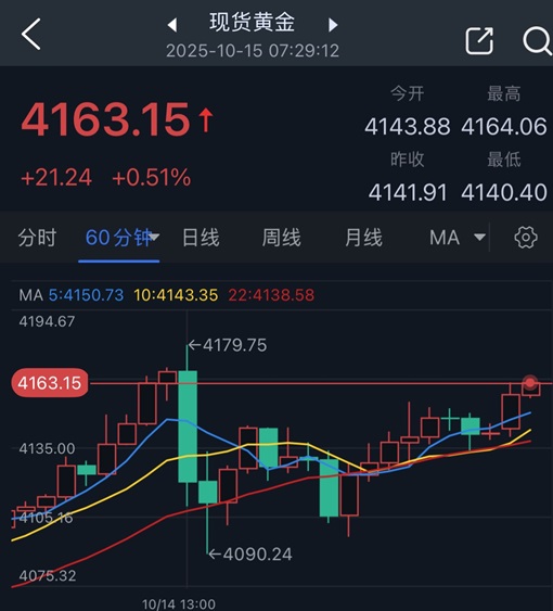 截至周二收盘,现货黄金报4141.91美元/盎司,日内大涨31.61美元。