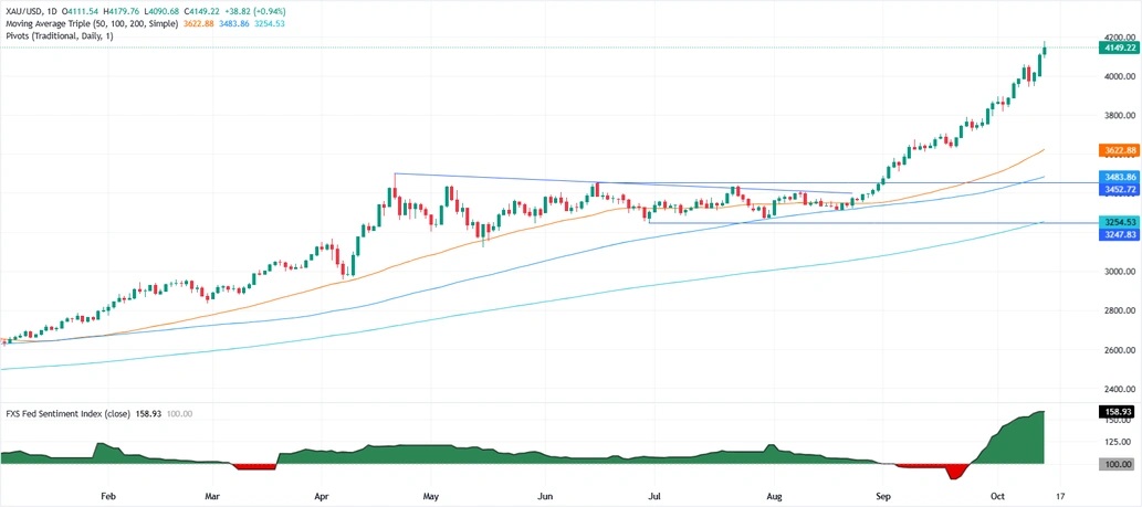 Valencia称,尽管金价达到4180美元/盎司附近的纪录高位,但金价仍偏向上行。由于相对强弱指数(RSI)看涨,势头有利于进一步上行,这表明买家正在积聚动力。