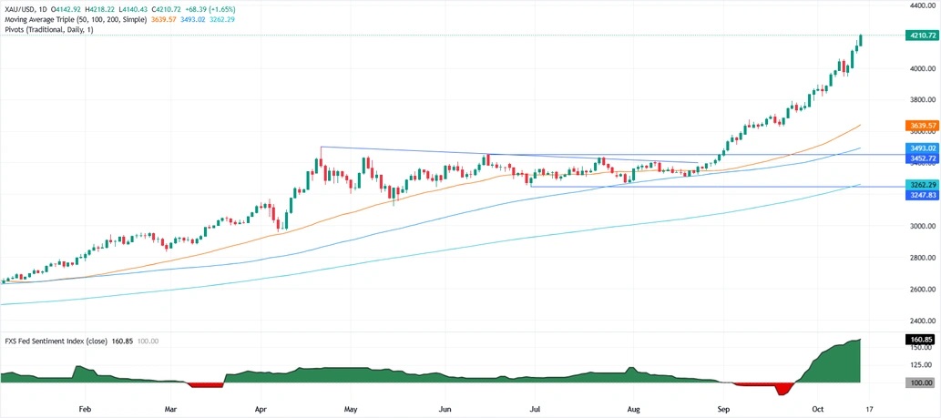 FXStreet分析师Christian Borjon Valencia指出,尽管金价在4218美元/盎司附近的纪录高位下方盘整,但仍维持看涨倾向。势头继续对买家有利,相对强弱指数(RSI)保持在看涨区域,这表明上行压力仍然很大。