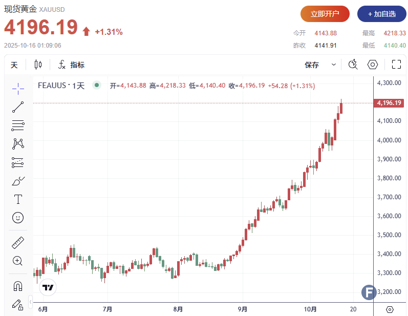 现货黄金最高触及每盎司4218.33美元的历史高位,截至发稿,现报每盎司4196.19美元。