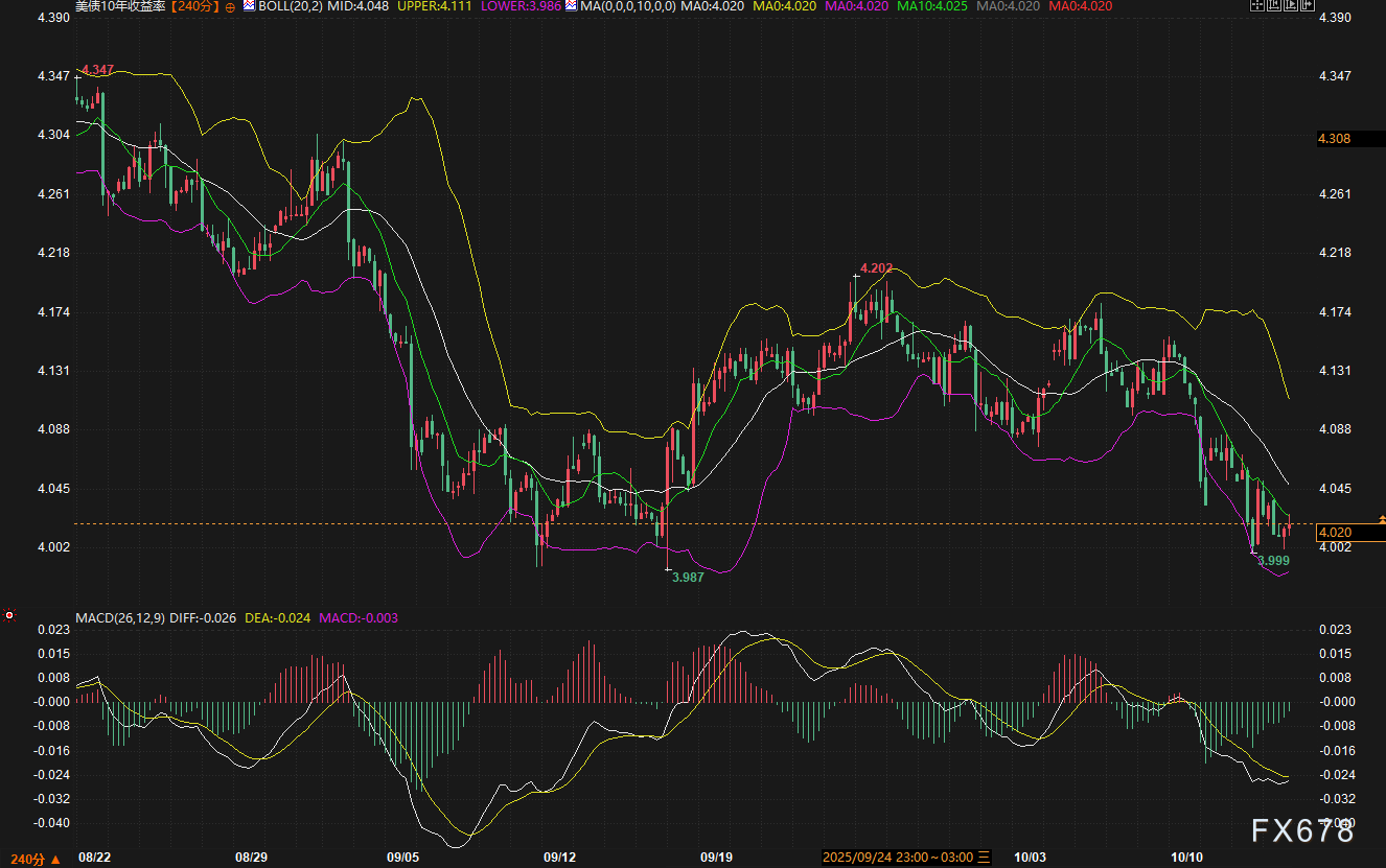技术面上,10年期美债收益率的布林带中轨位于-4.048%,显示通道中枢偏向下行。MACD指标DIFF报-0.026,DEA为-0.024,柱状图MACD值-0.003,整体呈弱势收敛迹象,暗示短期动能趋于平缓。若收益率能守住4.00%心理关口,则可能重回9月以来4.00%-4.20%的区间;反之,若收盘跌破3.98%,则或开启4.09%-3.80%的新通道。知名机构分析师指出,这一4%水平已成为范围交易的关键锚点,战术上保持中性,静待突破确认。隔夜债市的小幅走高反映了交易员对风险事件的警惕,尤其是潜在的关税言论可能引发的波动,这与近期市场从“关税言论”引发的逆转中恢复相呼应。