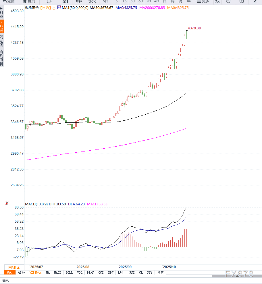 周五亚洲时段,现货黄金(XAU/USD)继续保持上行趋势,盘中一度触及4379美元/盎司,随后再次回落至4300美元附近。
