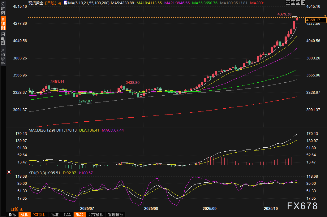 周五(10月17日)亚市早盘,现货黄金继续冲高,一度上涨1.24%,刷新历史高点至4379.38美元/盎司,较周四收盘价上涨逾50美元,本周迄今已经上涨近9%,周线大概率连续第九周上涨;周四金价大涨2.8%,为连续四个交易日收涨,收报4325.85美元/盎司,市场预计美联储10月将25个基点,12月甚至可能再降息50个点,SPDR黄金持仓大幅增加,汇丰银行也发布看涨报告,此外,美国政府继续停摆、国际贸易局势紧张也在持续吸引避险买盘支撑金价,各国央行购金以及去美元化趋势等多重因素也持续给金价提供上涨动能。