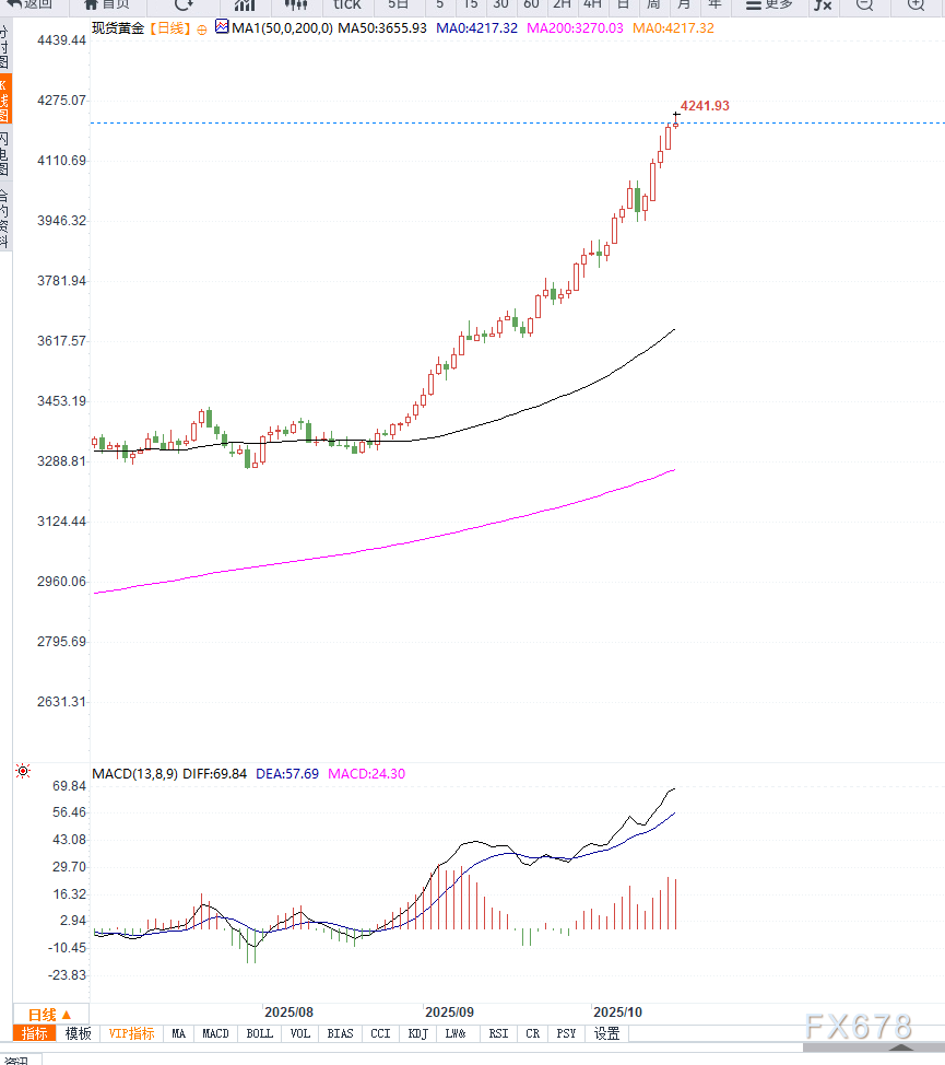 从技术形态看,XAU/USD自9月以来沿上升趋势线稳步攀升。价格有效突破4200美元整数关口,显示多头情绪依旧主导市场。