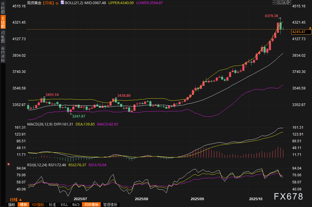 本周,由于美国政府停摆,市场依赖私营数据,包括周四的9月现有房屋销售和周五的9月CPI报告,以及标普PMI,这些将为美联储决策提供线索。Kitco黄金调查显示,华尔街分析师看涨情绪回落,60%预计金价上涨,27%看跌;主街散户则更乐观,68%看好上涨。这反映出在价格剧烈波动中,投资者情绪保持稳定。尽管短期回调,但黄金的长期潜力强劲,尤其在地缘风险和宽松政策双轮驱动下。