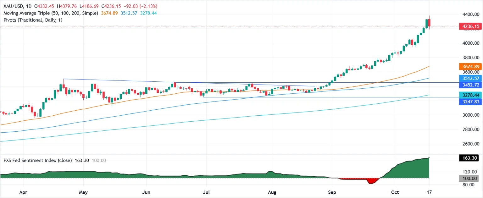 知名财经网站FXDailyReport分析师Nicholas Kitonyi指出,周五,金价从约4380美元/盎司的历史高位暴跌。从技术面来看,根据60分钟走势图,黄金价格处于一个下行通道内。14小时相对强弱指数(RSI)也支持短期看跌倾向,因其接近超卖状态。