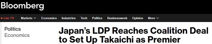 FX168财经报社(亚太)讯 美国彭博社周一(10月20日)最新报道称,据日本维新会领导人称,执政党自民党将于周一晚些时候与维新会签署联合执政协议,此举将使高市早苗(Sanae Takaichi)成为日本首位女首相。
