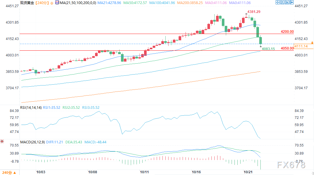 周二(10月21日)美盘时段,现货黄金价格在周一测试4380美元附近的历史高点后大幅走低,盘中报4112.41美元/盎司,跌幅5.6%。此次回调的背景是美元延续反弹态势,且在金价经历过度上涨后,交易员开始锁定获利。
