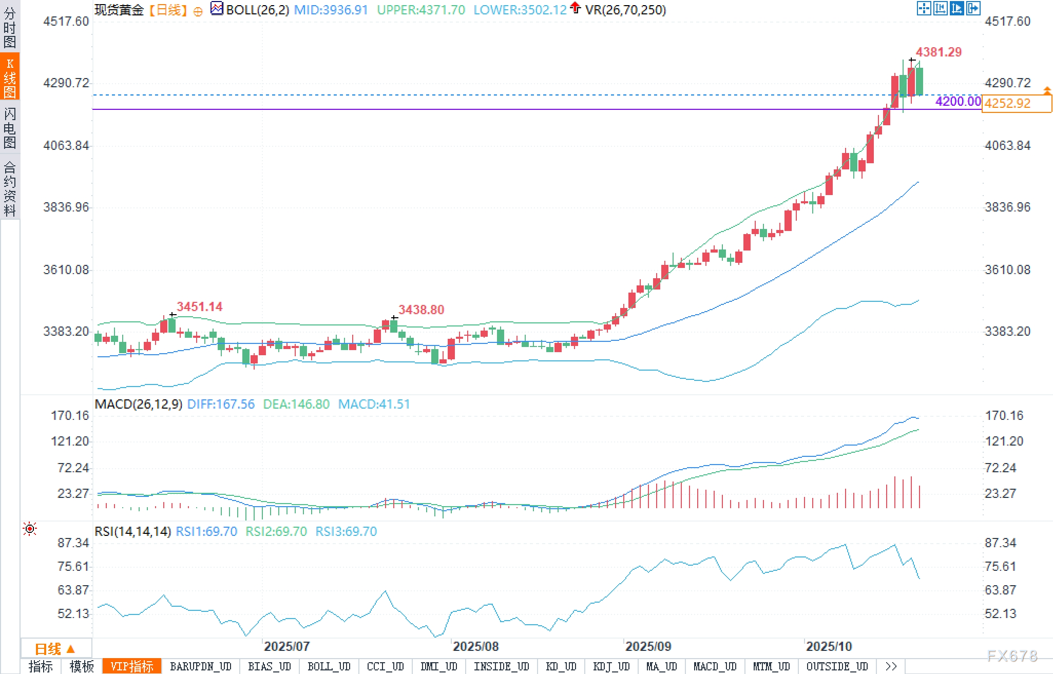 空头路径:若通胀超预期、美元与实际利率同步走强,金价可能回撤测试4200.00;若4200失守,3936.91(布林中轨)为下一道关键观察位。此情形多表现为趋势放缓而非立刻反转。