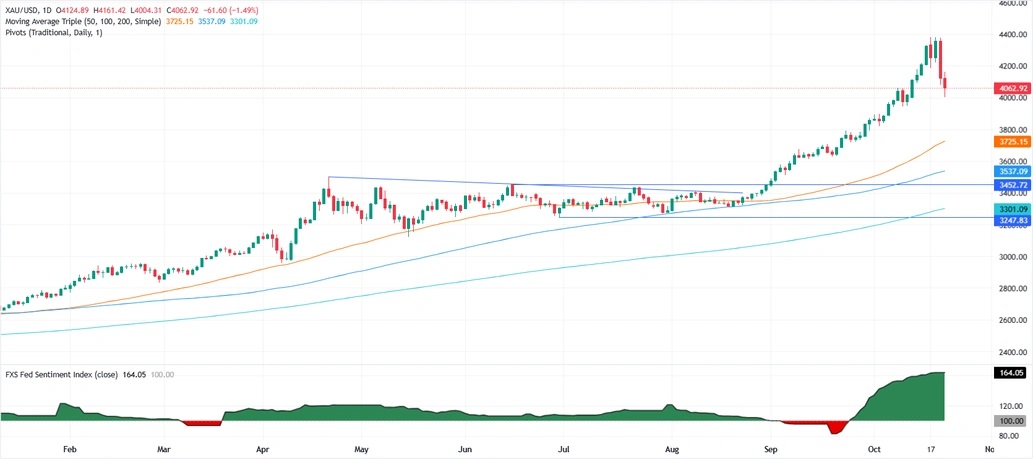 相反,Valencia补充道,如果金价跌破4059美元/盎司并维持在该位下方,那么这将为金价测试4000美元/盎司扫清道路。若金价跌破后者,可能加速跌势,为测试3900美元/盎司和50日移动均线3722美元/盎司扫清障碍。