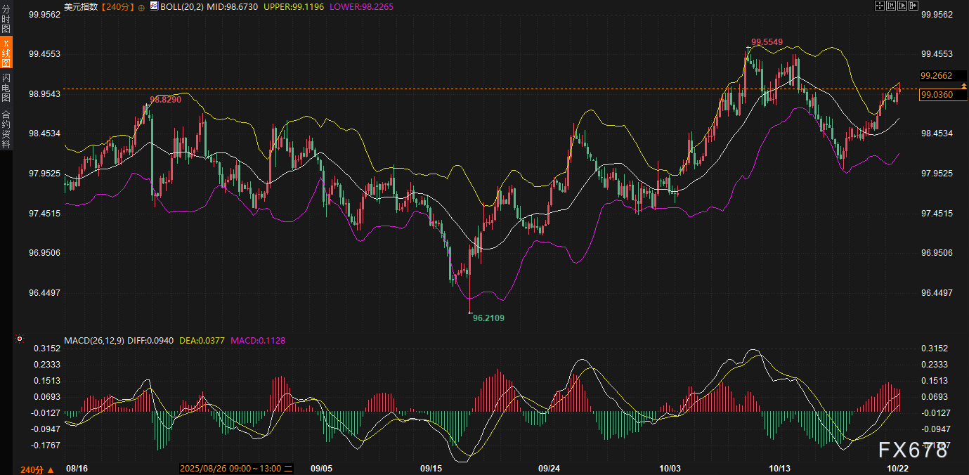 美元指数的微升并非孤立,而是美债收益率回落与全球风险偏好回暖的直接产物。从债市角度审视,10年期收益率的0.35%日内下行,直接缓解了美元融资成本压力,推动指数在99.0329站稳脚跟。这一传导机制在240分钟图上体现得淋漓尽致:布林带中轨99.0712已成为即时支撑,上轨99.5227与下轨98.6197间的空间虽宽,但指数目前紧贴中轨上方运行,显示出温和的多头倾斜。MACD指标DIFF 0.1637略低于DEA 0.1934,柱状线虽微弱负值,但整体零轴上方徘徊,暗示短期动能中性偏强,避免了急转直下的风险。