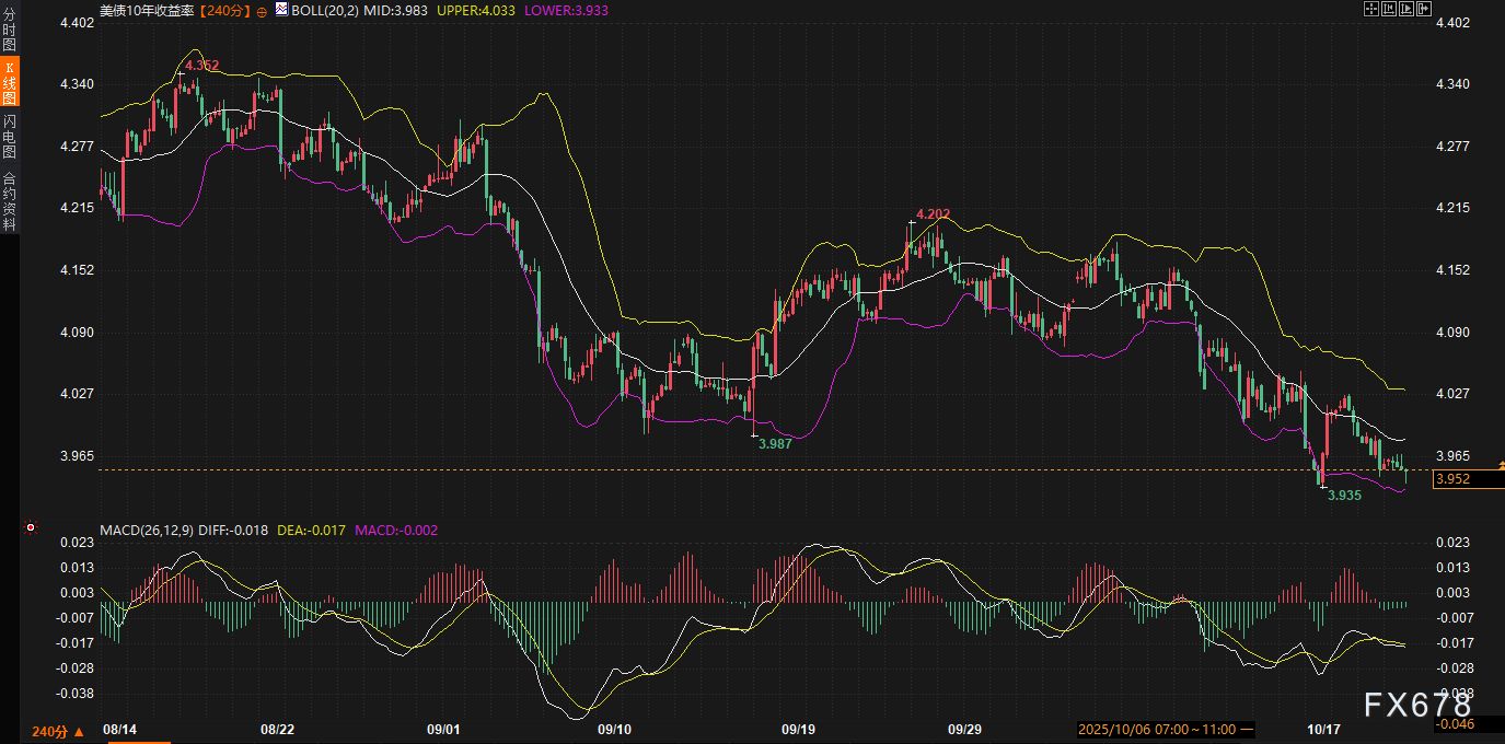 美债市场的核心叙事仍围绕收益率曲线的平坦化展开,这一趋势在周三延续,5年期与30年期利差一度收窄至97个基点,较9月高点足足压缩25个基点。这种牛市平坦化并非突发,而是投资者对美联储QT进程的集体调整所致——多家机构已将QT结束时点前移,这不仅缓解了供给压力,还为收益率下行提供了基本面支撑。10年期收益率目前徘徊在3.950%,距离近期低点3.936%仅一步之遥,布林带(20,2)指标显示中轨3.983、上轨4.033、下轨3.933,形成了一个相对紧凑的区间,暗示短期内缺乏突破动能。