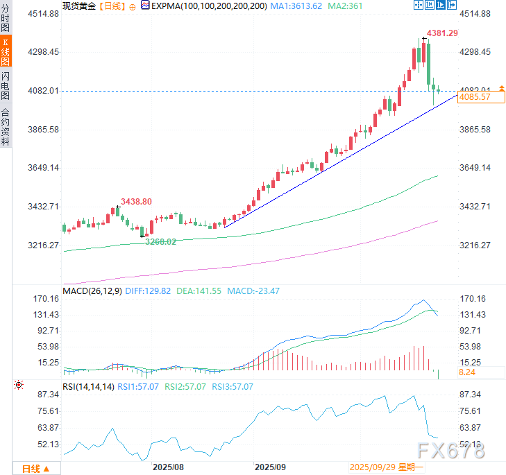 金价日内虽下行,但从日线图看,其结构性看涨前景依然稳固,目前价格在关键的100日指数移动平均线(EMA,3613.62)上方获得良好支撑。