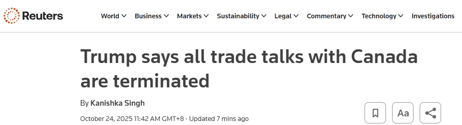 FX168财经报社(亚太)讯 美国总统特朗普(Donald Trump)当地时间周四(10月24日)晚间宣布,终止与加拿大的所有贸易谈判。