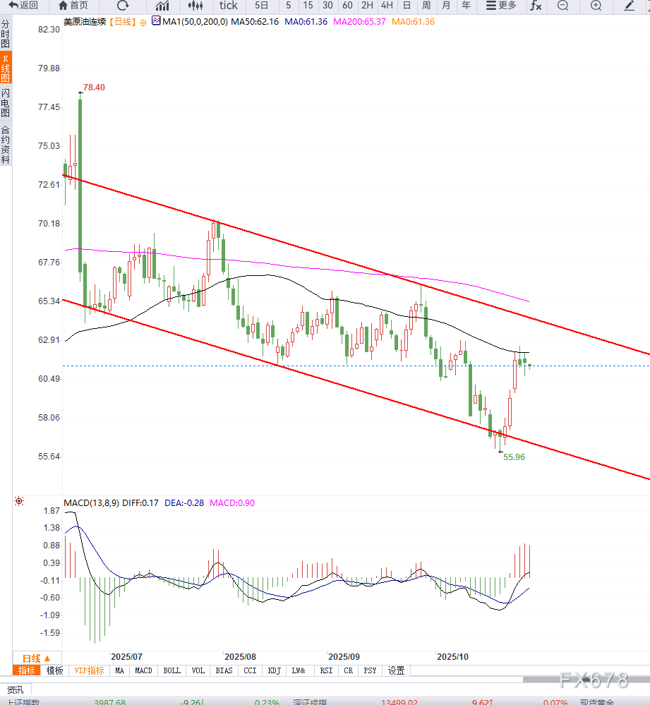 从技术面看,WTI原油日线图呈现短线承压走势。价格在60美元/桶附近存在明显支撑位,而上方阻力位集中在62.50美元区域。若油价持续受压于该区间,短线或将测试59.80美元支撑水平。