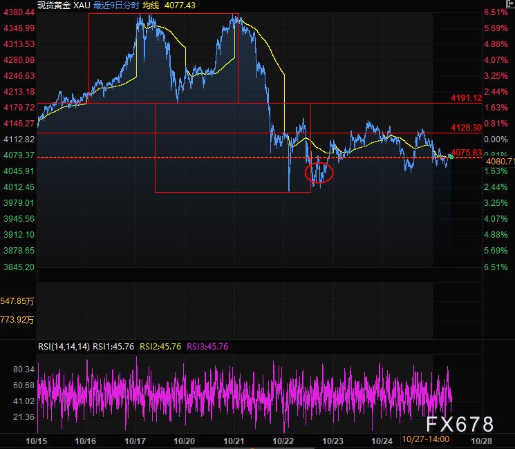 现货黄金分时图显示金价处于区间震荡,且亚洲时段反弹偏弱,目前正在争夺红圈处双底形态的颈线4075一带,4128是反弹第一压力位,支撑就在4075,之后则是前低的4000点也是黄金重要整数关口。