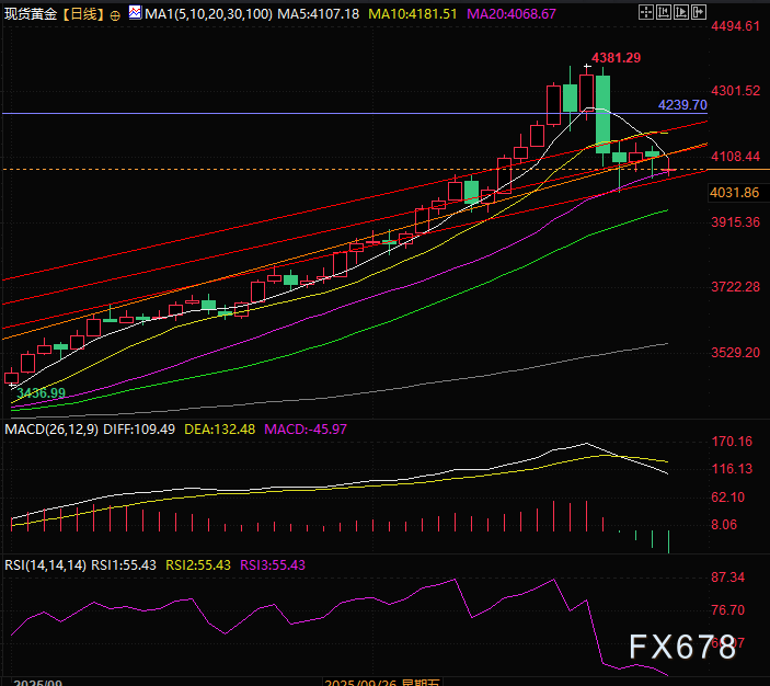 回溯上周表现,金价回调态势已显现,上周全周累计跌幅达3.3%。同期,值得注意的是,10月21日黄金价格曾出现单日暴跌逾6.3%的极端行情,创下2013年以来最大单日跌幅,并在10月24日持续维持跌势,最终收于每盎司4112.82美元。以美元计价,该品种单周下跌超138美元,此跌幅跻身历史最大单周跌幅区间。